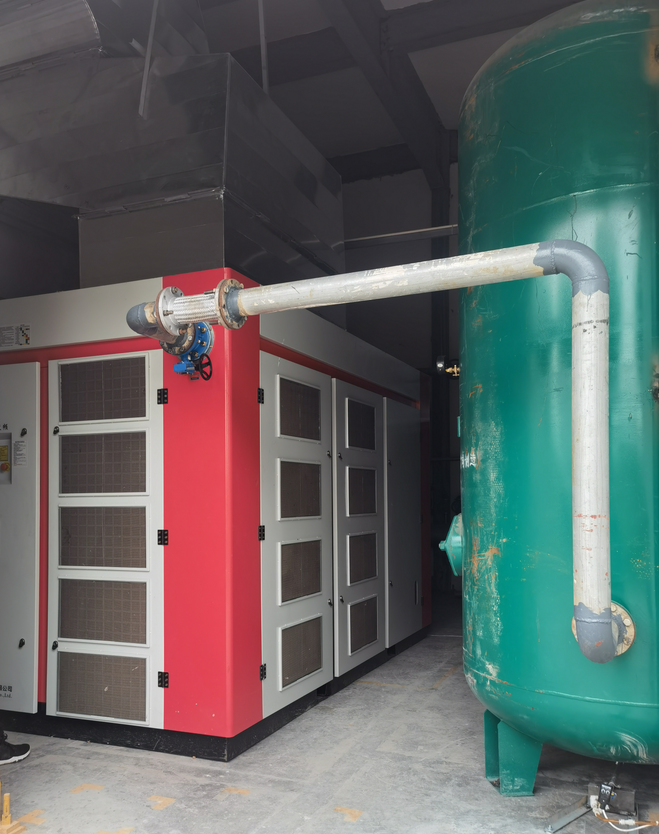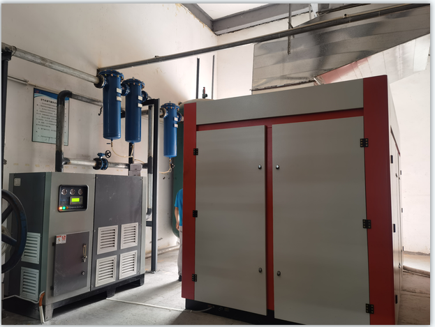 某紡織公司空壓機節能項目:因公司生產需要,增加一套185kw大型兩級壓縮永磁變頻螺桿式空壓機替代多臺中小空壓機,增加了機房的空間環境,對機器的運行、散熱、維修維護的方便性都有很大的效率,提高節能效果,為企業節約電費。